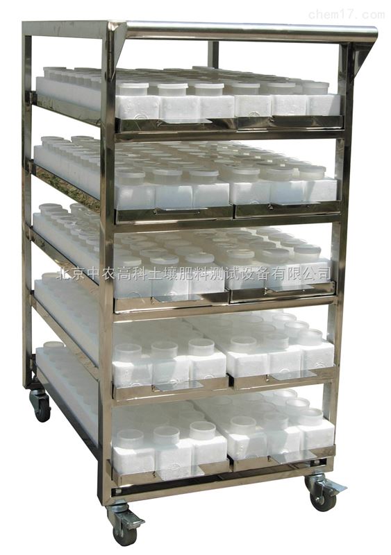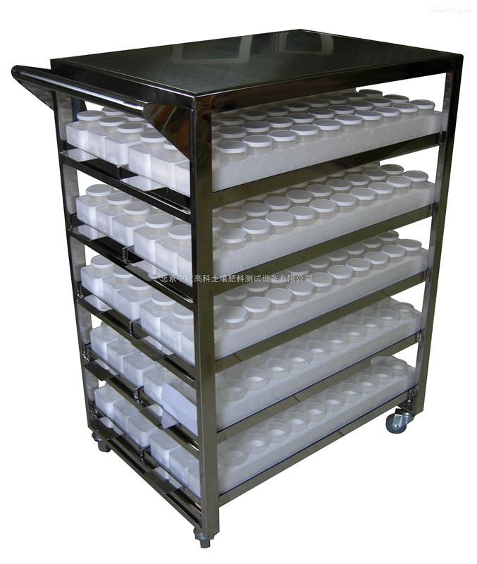 在测定过程中,量样、加浸提剂、加显色剂、比色等过程往往不在同一地方进行,为了方便移动,该套设备中还配备了五台样品车。是由铝合金制成的,共有5层,每层可放置2个样品杯托架,所以,每个样品车可放置10个样品杯托架。的顶部是一个平台,可将样品托架及样品杯置于样品车上,进行加液、稀释和测定。因此,在实验室设计时,需留出一定的空间,能使样品车在各实验台间通过。试验停止时,可将样品杯洗干净,倒扣在样品托盘上,将样品车置于实验台下边,以节约实验室的空间。